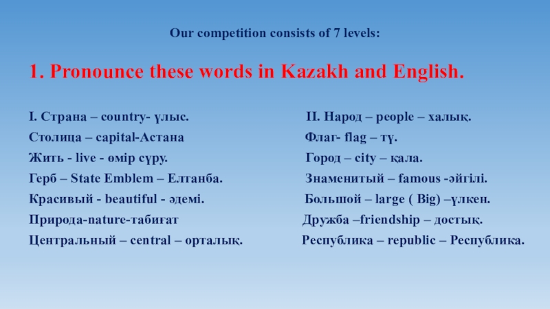 The pupils of 10-th forms take part in this competition. We’ ll need 2 teams ( 5 students in each team ). Our game is devoted to the 25th anniversary of Independence of our Republic. The theme is “Blossom my country, Kazakhstan!”. We know that the property of our country is a nation. But all people must be educated and purposeful. Our future is a modern educated society. N. A. Nazarbaev pays great attention to education, science and culture in his” Message to the People of Kazakhstan.” He also underlines that new generation must know 3 languages ( Kazakh, English and Russian ) and use them in communication. Our President N.A.Nazarbayev said: “Every person in our country must know 3 languages : Kazakh-as a state language, Russian-as a language of international communication and English –as a widespread language in the world, as a language of a business and new technology” We’ll define the experts, you should count points of two teams and later each level talk result. Participants say their team’s name, about emblem, motto.