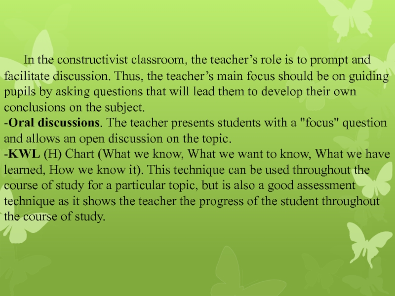 Слайд 14 In the constructivist classroom, the teacher’s role is to prompt and