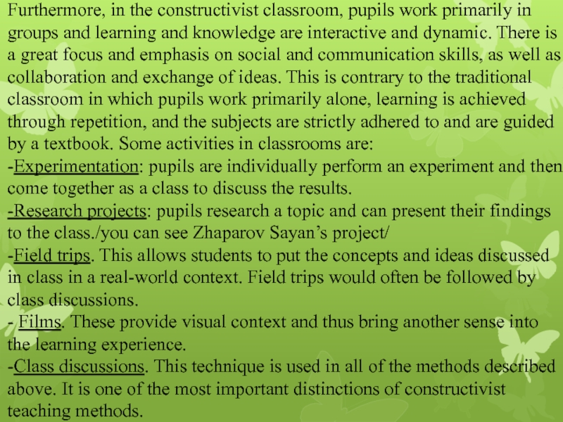 Furthermore, in the constructivist classroom, pupils work primarily in groups and