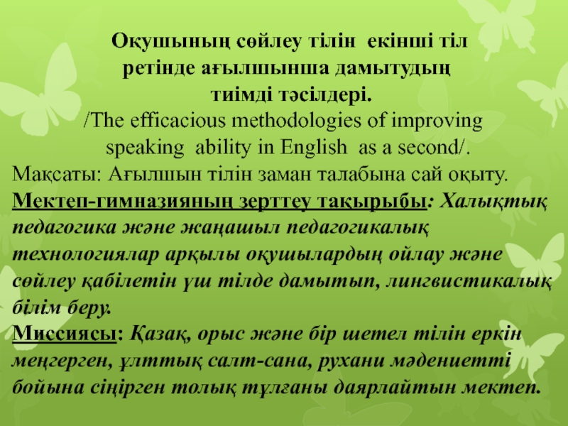 Слайд 2 Мектеп –гимназияның миссиясын орындау мақсатында ағылшын тілін дамыта оқыту біздің