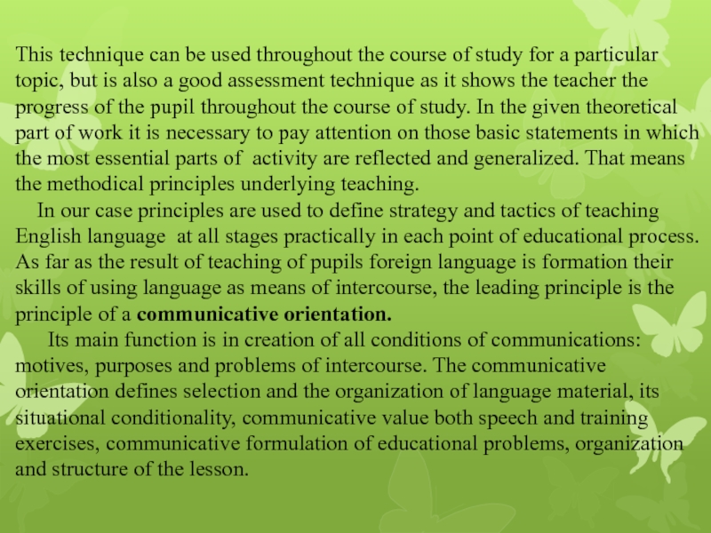 a particular topic, but is also a good assessment technique as it shows the teacher the progress of the pupil throughout the course of study. In the given theoretical part of work it is necessary to pay attention on those basic statements in which the most essential parts of activity are reflected and generalized. That means the methodical principles underlying teaching.