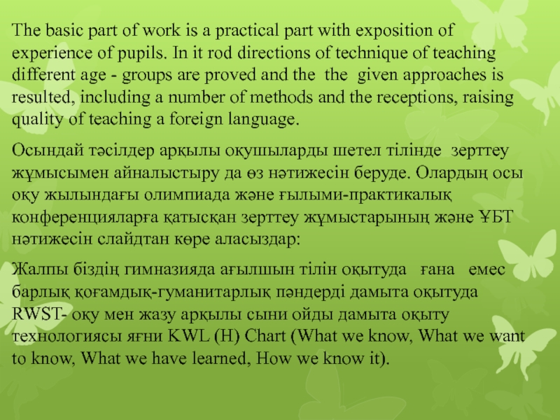 Жалпы біздің гимназияда ағылшын тілін оқытуда ғана емес барлық қоғамдық-гуманитарлық пәндерді дамыта оқытуда RWST- оқу мен жазу арқылы сыни ойды дамыта оқыту технологиясы яғни KWL (H) Chart (What we know, What we want to know, What we have learned, How we know it).
