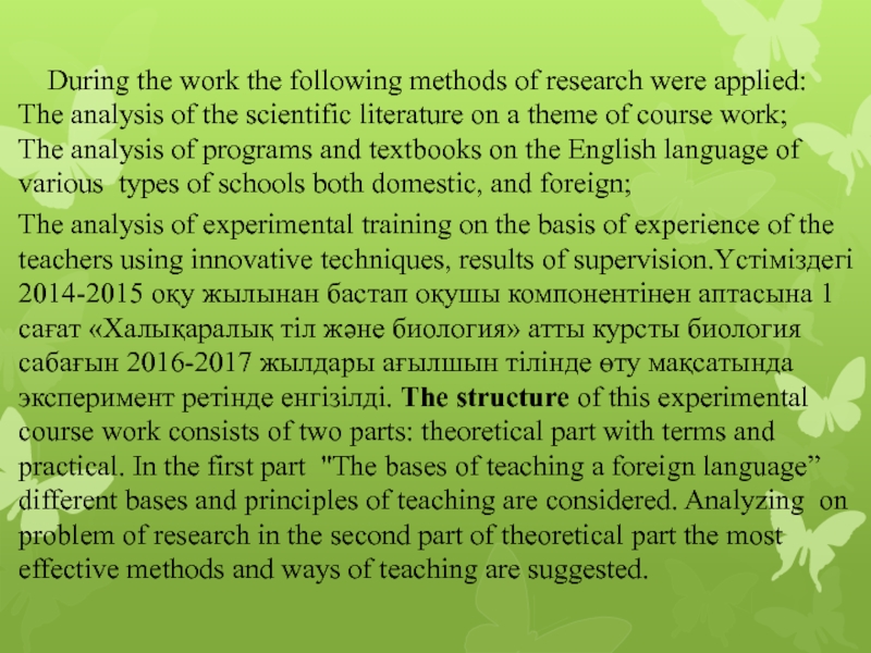 The analysis of experimental training on the basis of experience of the teachers using innovative techniques, results of supervision.Үстіміздегі 2014-2015 оқу жылынан бастап оқушы компонентінен аптасына 1 сағат «Халықаралық тіл және биология» атты курсты биология сабағын 2016-2017 жылдары ағылшын тілінде өту мақсатында эксперимент ретінде енгізілді. The structure of this experimental course work consists of two parts: theoretical part with terms and practical. In the first part "The bases of teaching a foreign language” different bases and principles of teaching are considered. Analyzing on problem of research in the second part of theoretical part the most effective methods and ways of teaching are suggested.