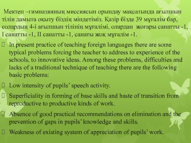 міндетіміз. Қазір бізде 39 мұғалім бар, солардың 4-і ағылшын тілінің мұғалімі, олардан жоғары санатты -1, І санатты -1, ІІ санатты -1, санаты жоқ мұғалім -1.
