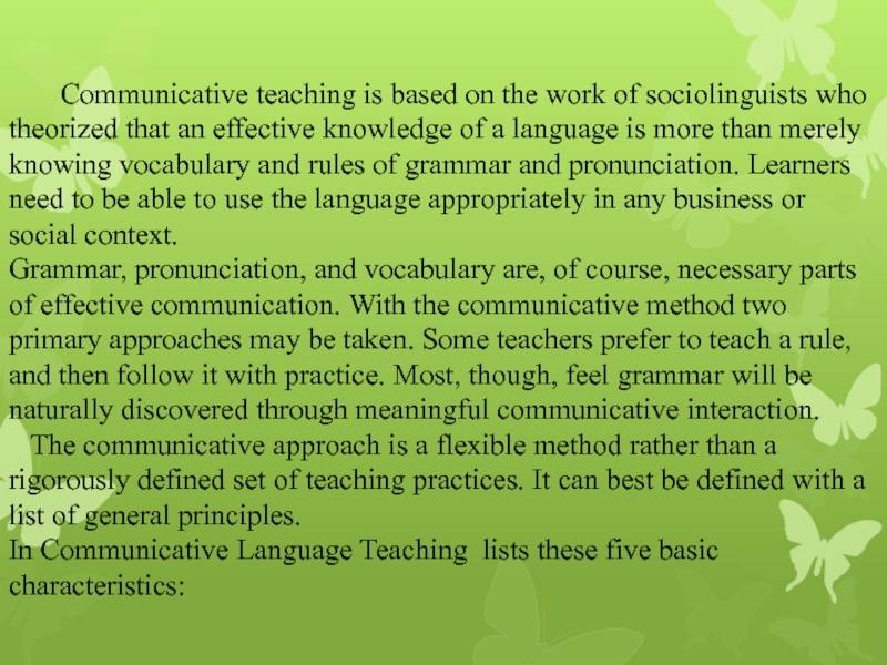 Communicative teaching is based on the work of sociolinguists who theorized that an effective knowledge of a language is more than merely knowing vocabulary and rules of grammar and pronunciation. Learners need to be able to use the language appropriately in any business or social context.