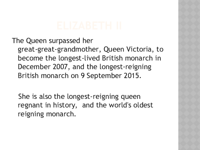 Elizabeth IIThe Queen surpassed her great-great-grandmother, Queen Victoria, to become the longest-lived British monarch in December 2007,