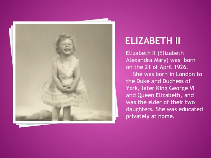 Elizabeth IIElizabeth II (Elizabeth Alexandra Mary) was born on the 21 of April 1926.  She was
