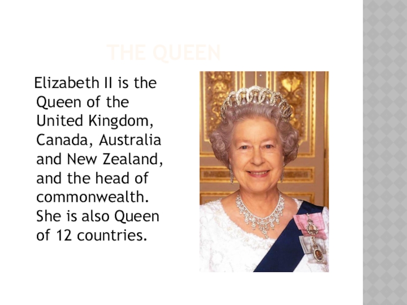 is the Queen of the United Kingdom, Canada, Australia and New Zealand, and the head of commonwealth. She is also Queen of 12 countries.