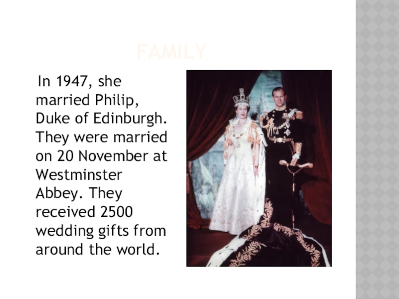 In 1947, she married Philip, Duke of Edinburgh. They were married on 20 November at Westminster Abbey. They received 2500 wedding gifts from around the world.