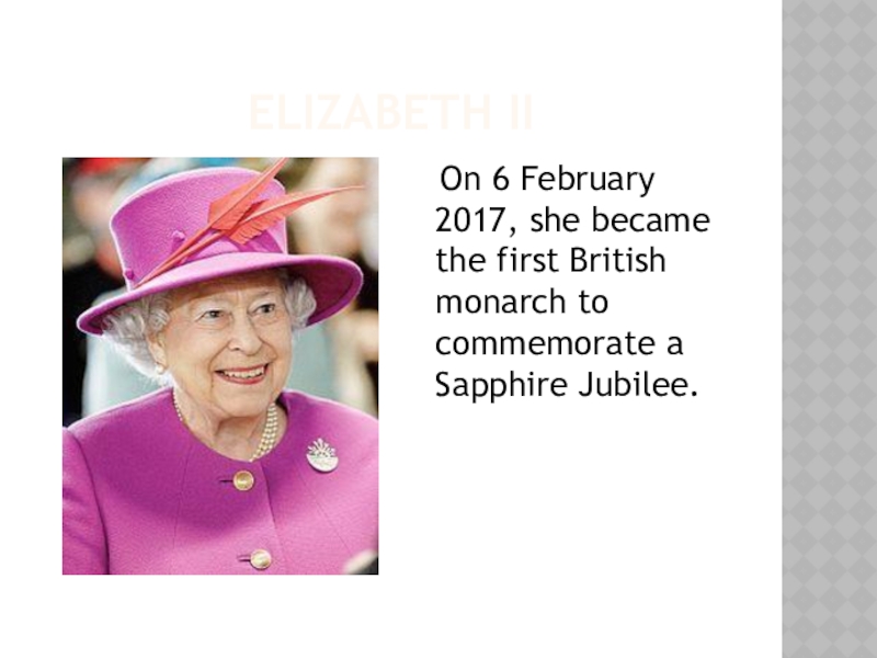 Elizabeth II  On 6 February 2017, she became the first British monarch to commemorate a Sapphire
