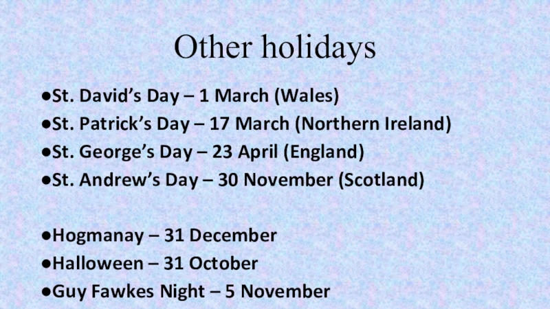 Other holidaysSt. David’s Day – 1 March (Wales)St. Patrick’s Day – 17 March (Northern Ireland)St. George’s Day