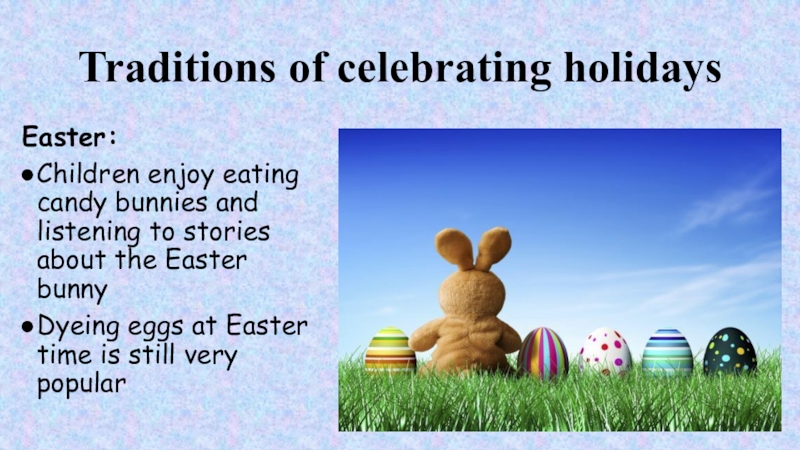Traditions of celebrating holidaysEaster:Children enjoy eating candy bunnies and listening to stories about the Easter bunnyDyeing eggs