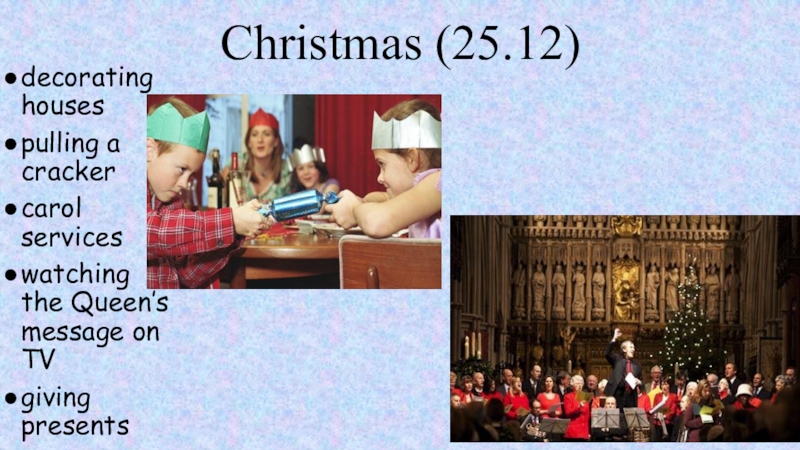 Christmas (25.12)decorating housespulling a crackercarol serviceswatching the Queen’s message on TVgiving presents