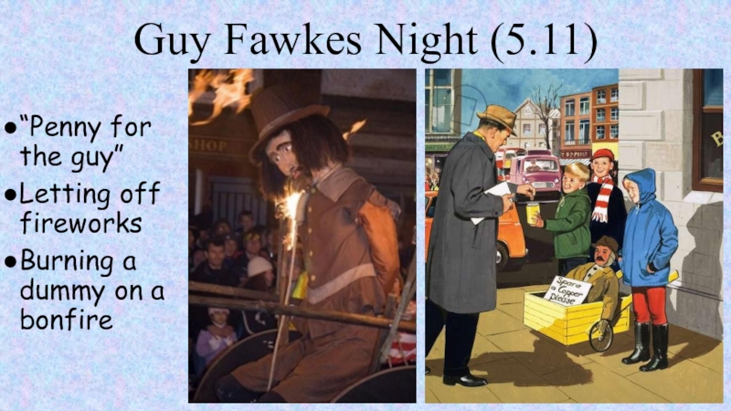 Guy Fawkes Night (5.11)“Penny for the guy”Letting off fireworksBurning a dummy on a bonfire