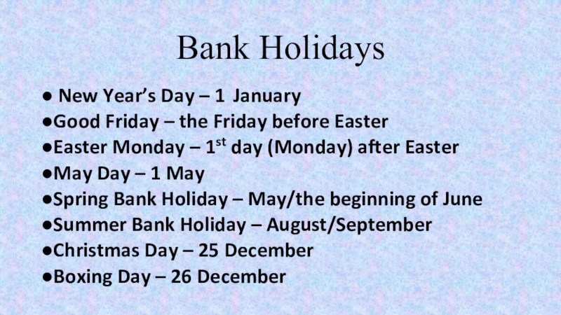 Bank Holidays New Year’s Day – 1 JanuaryGood Friday – the Friday before EasterEaster Monday – 1st day (Monday) after EasterMay Day – 1 MaySpring Bank Holiday – May/the beginning of JuneSummer Bank Holiday – August/SeptemberChristmas