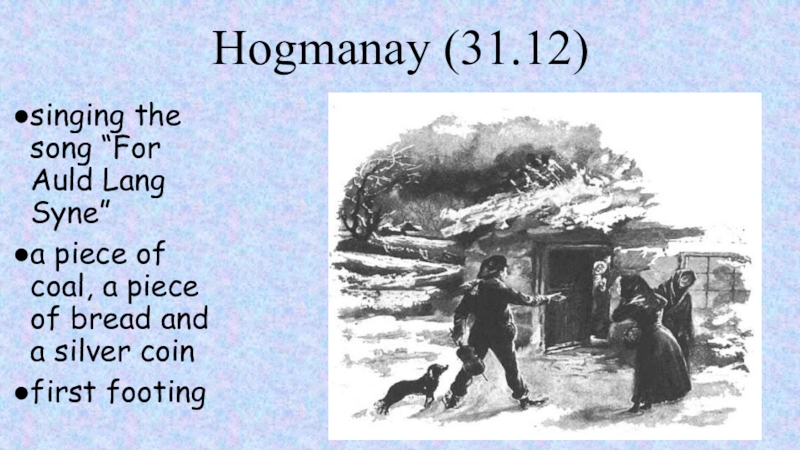 Hogmanay (31.12)singing the song “For Auld Lang Syne”a piece of coal, a piece of bread and a