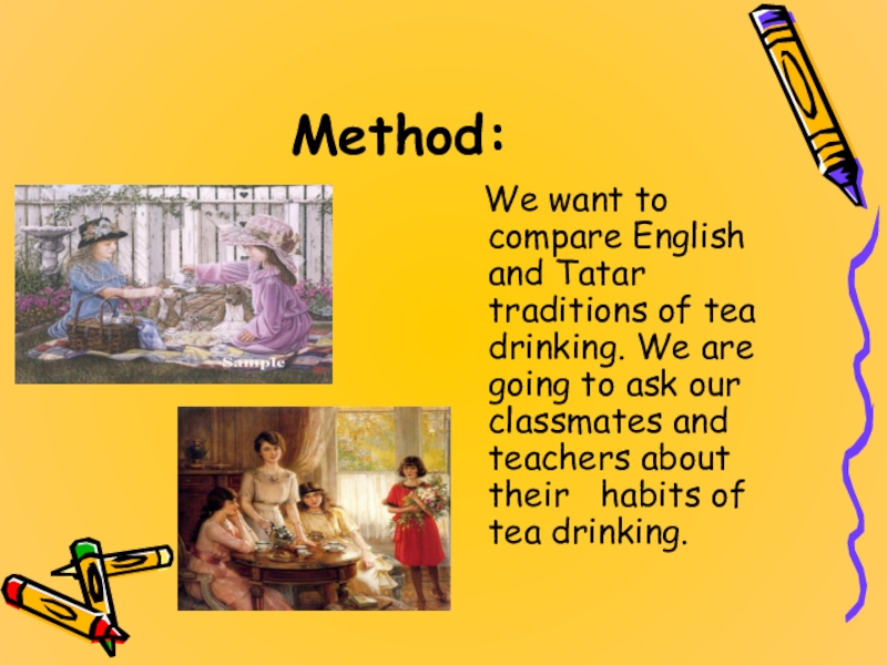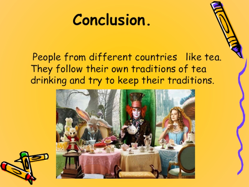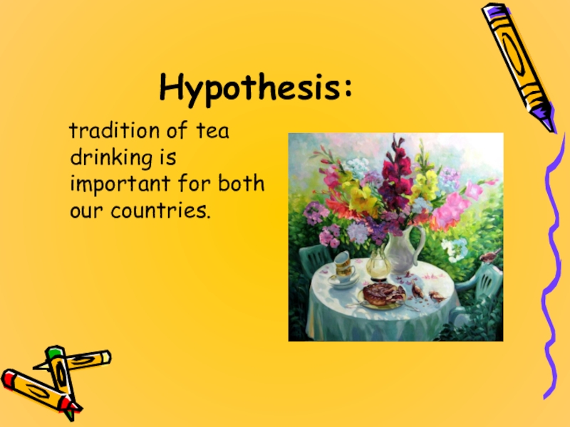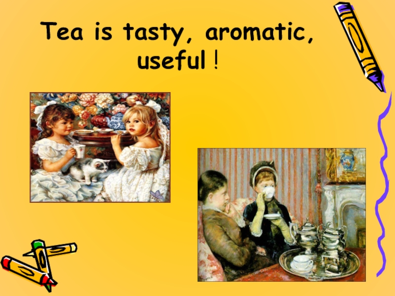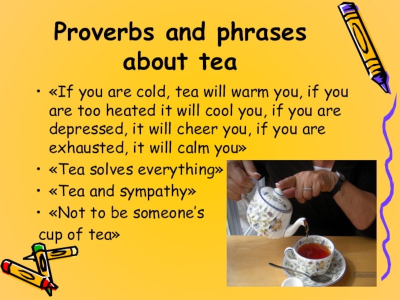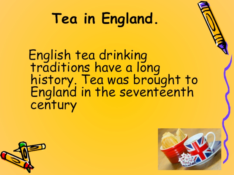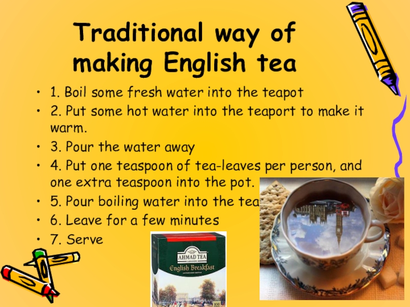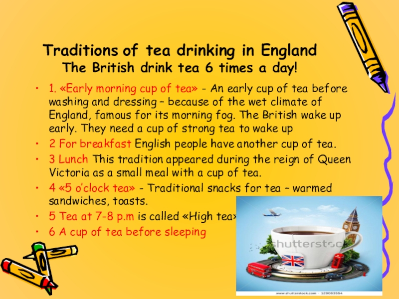 1. «Early morning cup of tea» - An early cup of tea before washing and dressing – because of the wet climate of England, famous for its morning fog. The British wake up early. They need a cup of strong tea to wake up