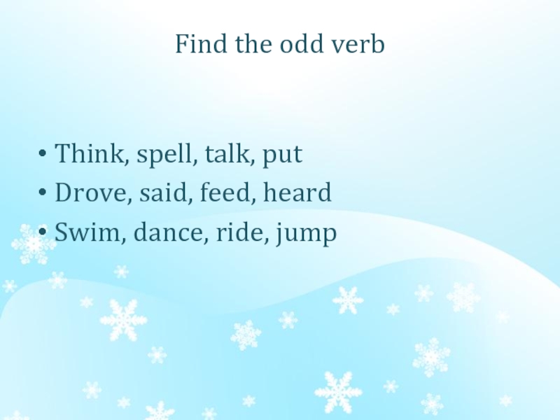 Find the odd verbThink, spell, talk, putDrove, said, feed, heardSwim, dance, ride, jump