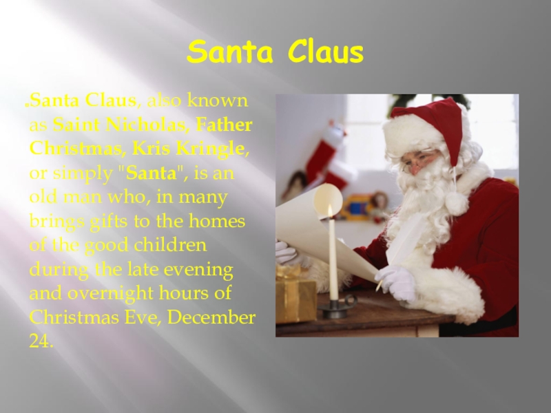 Kringle, or simply "Santa", is an old man who, in many brings gifts to the homes of the good children during the late evening and overnight hours of Christmas Eve, December 24.
