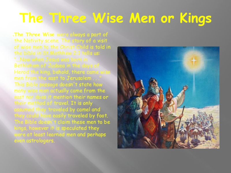 a part of the Nativity scene. The story of a visit of wise men to the Christ Child is told in the bible in St.Mathhew 2:1 tells us: "...Now when Jesus was born in Bethlehem of Judaea in the days of Herod the king, behold, there came wise men from the east to Jerusalem . . ." This Bible passage doesn't state how many wise men actually came from the east nor does it mention their names or their method of travel. It is only assumed they traveled by camel and they could have easily traveled by foot. The Bible doesn't claim these men to be kings, however it is speculated they were at least learned men and perhaps even astrologers.