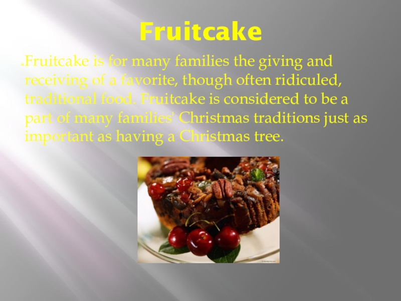 a favorite, though often ridiculed, traditional food. Fruitcake is considered to be a part of many families' Christmas traditions just as important as having a Christmas tree.