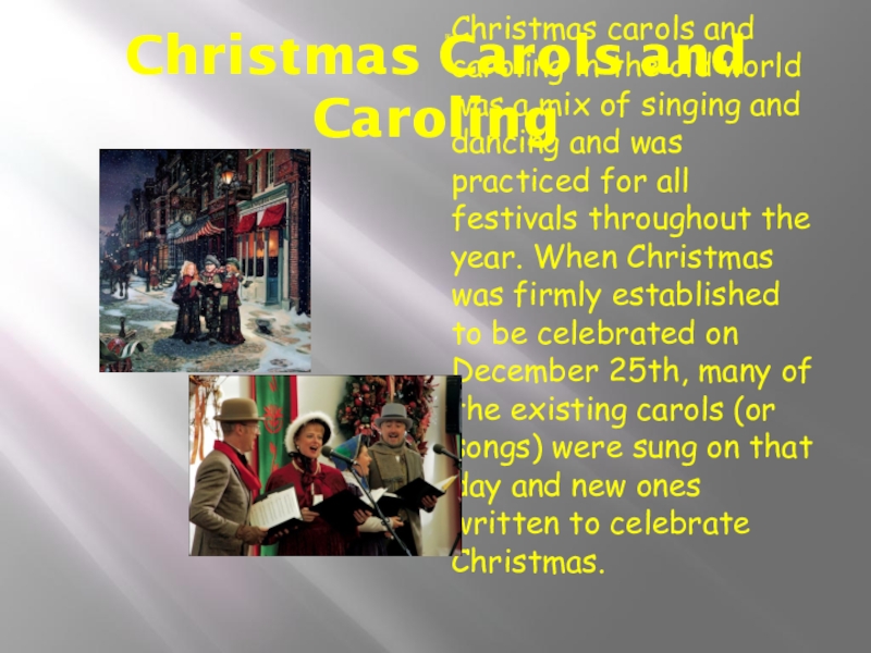 world was a mix of singing and dancing and was practiced for all festivals throughout the year. When Christmas was firmly established to be celebrated on December 25th, many of the existing carols (or songs) were sung on that day and new ones written to celebrate Christmas.