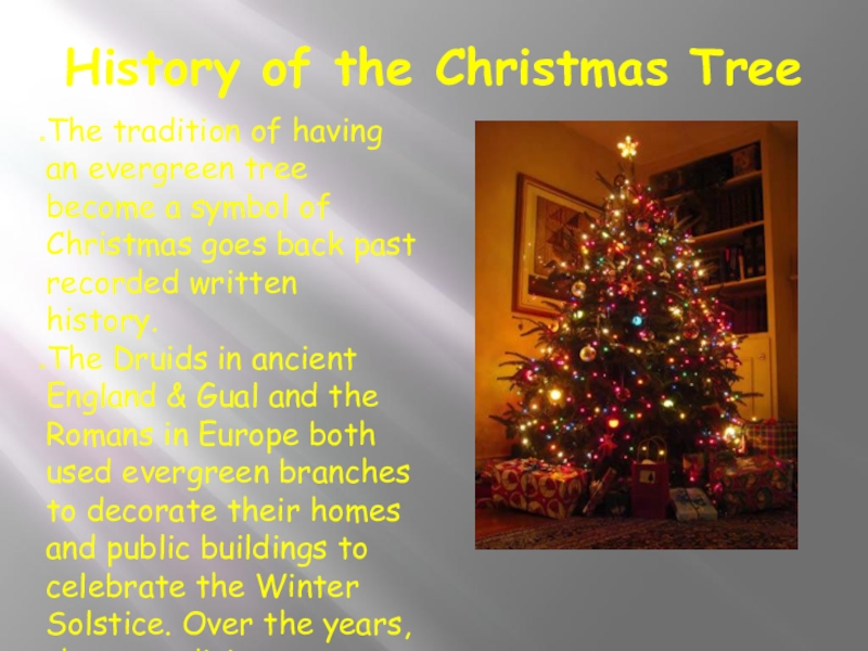 The Druids in ancient England & Gual and the Romans in Europe both used evergreen branches to decorate their homes and public buildings to celebrate the Winter Solstice. Over the years, these traditions were adopted by Christians, who incorporated them as part of their Christmas holiday celebration.