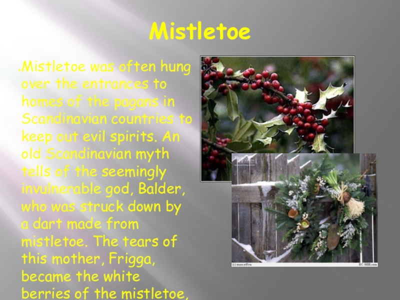 the pagans in Scandinavian countries to keep out evil spirits. An old Scandinavian myth tells of the seemingly invulnerable god, Balder, who was struck down by a dart made from mistletoe. The tears of this mother, Frigga, became the white berries of the mistletoe, and it was decreed that the plant must never again be used as a weapon.