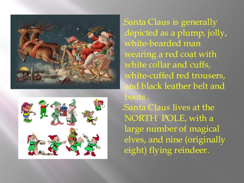 Слайд 4Santa Claus is generally depicted as a plump, jolly, white-bearded man