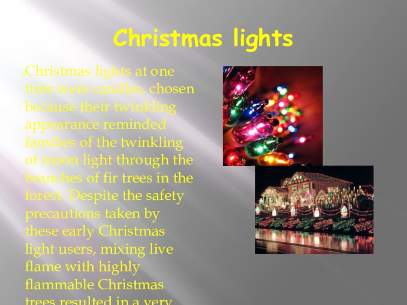 twinkling appearance reminded families of the twinkling of moon light through the branches of fir trees in the forest. Despite the safety precautions taken by these early Christmas light users, mixing live flame with highly flammable Christmas trees resulted in a very dangerous situation and many fires resulted.