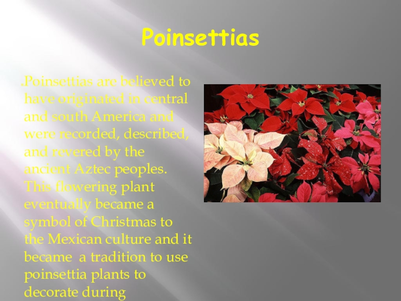 and were recorded, described, and revered by the ancient Aztec peoples. This flowering plant eventually became a symbol of Christmas to the Mexican culture and it became a tradition to use poinsettia plants to decorate during Christmas time.