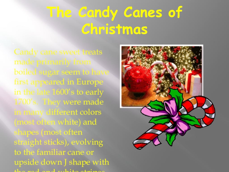 boiled sugar seem to have first appeared in Europe in the late 1600’s to early 1700’s. They were made in many different colors (most often white) and shapes (most often straight sticks), evolving to the familiar cane or upside down J shape with the red and white stripes in the early 1900’s.