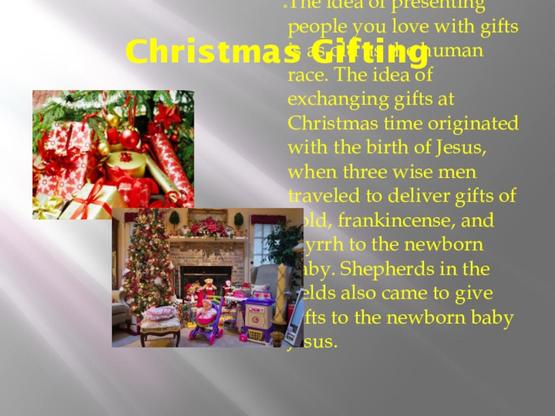 as old as the human race. The idea of exchanging gifts at Christmas time originated with the birth of Jesus, when three wise men traveled to deliver gifts of gold, frankincense, and myrrh to the newborn baby. Shepherds in the fields also came to give gifts to the newborn baby Jesus.