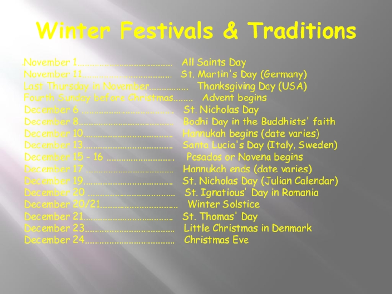 December 13..................................... Santa Lucia's Day (Italy, Sweden)