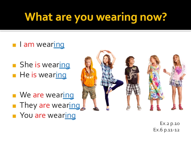 What are you wearing now?I am wearingShe is wearingHe is wearingWe are wearingThey are wearingYou are wearingEx.2