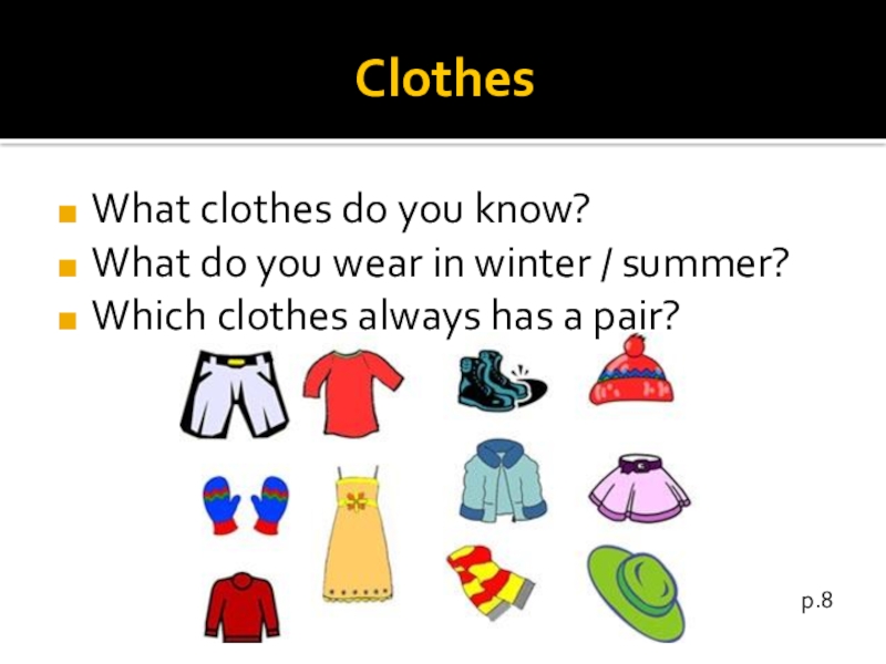ClothesWhat clothes do you know?What do you wear in winter / summer?Which clothes always has a pair?p.8
