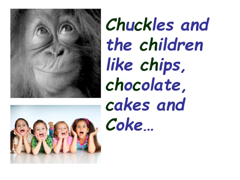 Слайд 6Chuckles and the children like chips, chocolate, cakes and Coke…