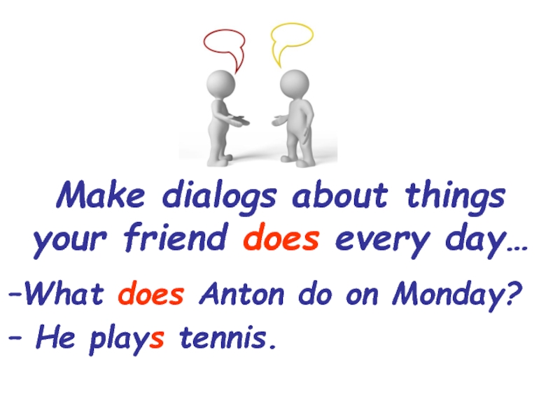 Make dialogs about things your friend does every day…What does Anton do on Monday? He plays tennis.