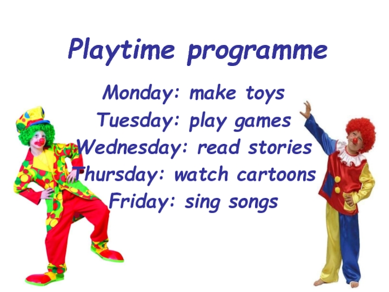 Playtime programmeMonday: make toysTuesday: play gamesWednesday: read storiesThursday: watch cartoonsFriday: sing songs