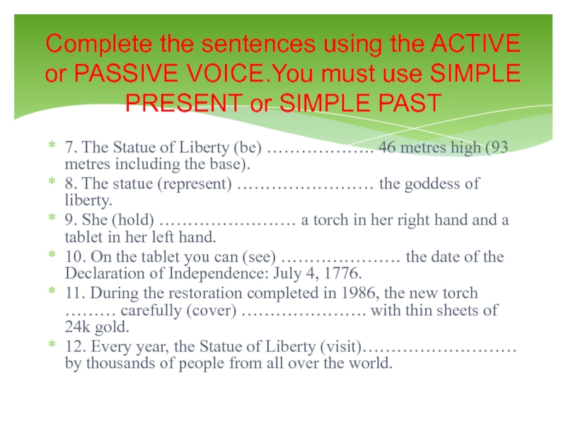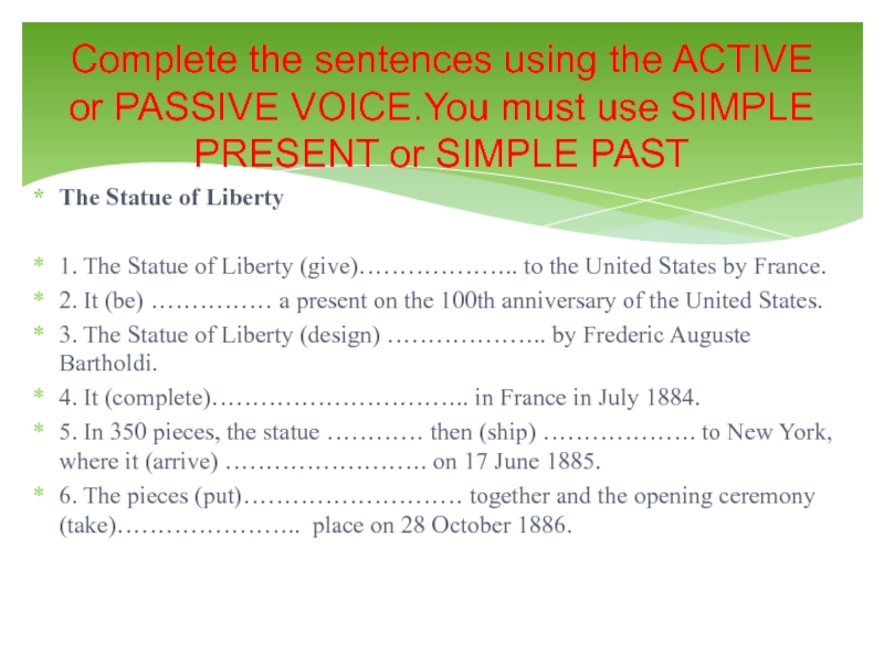 Complete the sentences using the ACTIVE or PASSIVE VOICE.You must use SIMPLE PRESENT or SIMPLE PAST