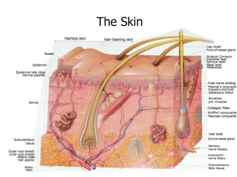 cover of a person, which has an effect on the functioning of all internal organs and systems. The skin performs a number of vital functions that ensure the normal functioning of all body systems. The main functions of the skin include: protective function (mechanical protection, protection against ultraviolet, protection against microorganisms, maintenance of water balance), thermoregulatory function, exchange function, receptor function, participation in water-salt metabolism, excretory function (excretion with sweat and sebum metabolic products, medicinal and toxic substances), the resorption function (absorption in the systemic bloodstream of substances falling on the skin, surface vascular plexuses), the immune function (synthesis in the epidermis interle ykin and other cytokines, capture, processing and transport of antigens).