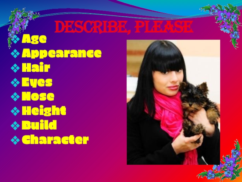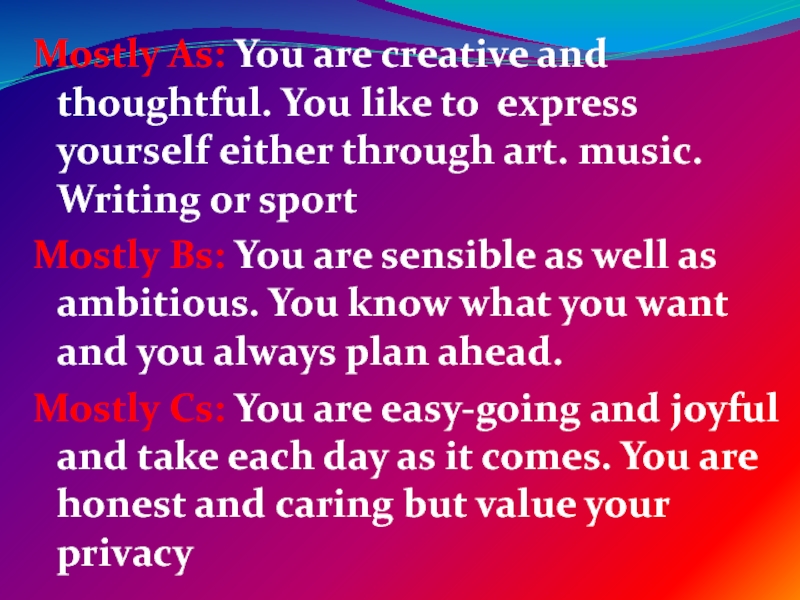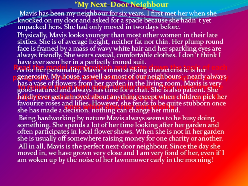 As for her personality, Mavis`s most striking characteristic is her generosity. My house, as well as most of our neighbours`, nearly always has a vase of flowers from her garden in the living room. Mavis is very good-natured and always has time for a chat. She is also patient. She hardly ever gets annoyed about anything except when children pick her favourite roses and lilies. However, she tends to be quite stubborn once she has made a decision, nothing can change her mind.