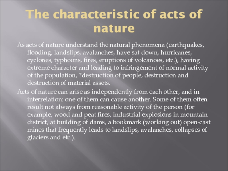 Acts of nature can arise as independently from each other, and in interrelation: one of them can cause another. Some of them often result not always from reasonable activity of the person (for example, wood and peat fires, industrial explosions in mountain district, at building of dams, a bookmark (working out) open-cast mines that frequently leads to landslips, avalanches, collapses of glaciers and etc.).