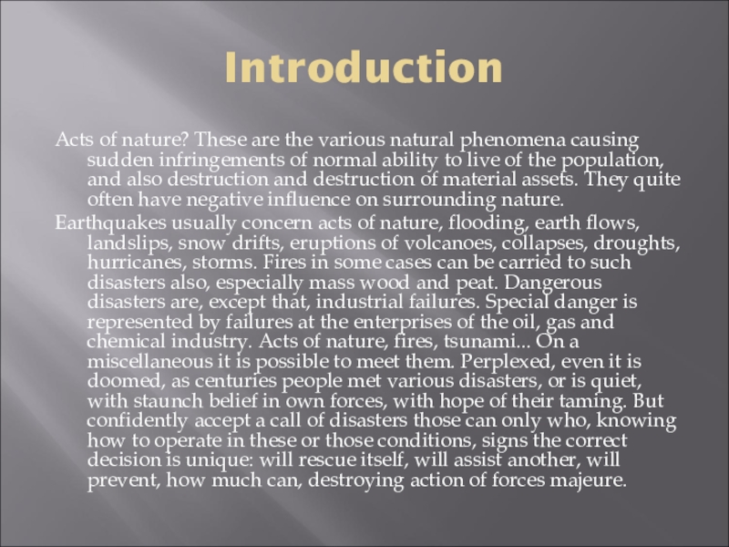 Earthquakes usually concern acts of nature, flooding, earth flows, landslips, snow drifts, eruptions of volcanoes, collapses, droughts, hurricanes, storms. Fires in some cases can be carried to such disasters also, especially mass wood and peat. Dangerous disasters are, except that, industrial failures. Special danger is represented by failures at the enterprises of the oil, gas and chemical industry. Acts of nature, fires, tsunami... On a miscellaneous it is possible to meet them. Perplexed, even it is doomed, as centuries people met various disasters, or is quiet, with staunch belief in own forces, with hope of their taming. But confidently accept a call of disasters those can only who, knowing how to operate in these or those conditions, signs the correct decision is unique: will rescue itself, will assist another, will prevent, how much can, destroying action of forces majeure.