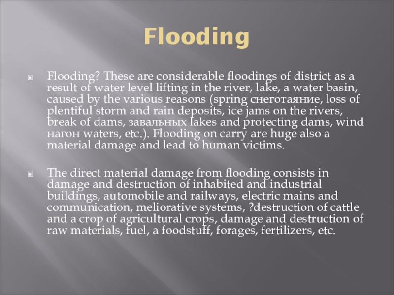 The direct material damage from flooding consists in damage and destruction of inhabited and industrial buildings, automobile and railways, electric mains and communication, meliorative systems, ?destruction of cattle and a crop of agricultural crops, damage and destruction of raw materials, fuel, a foodstuff, forages, fertilizers, etc.
