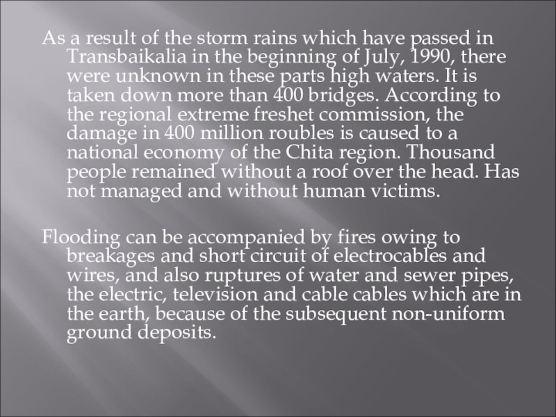 Transbaikalia in the beginning of July, 1990, there were unknown in these parts high waters. It is taken down more than 400 bridges. According to the regional extreme freshet commission, the damage in 400 million roubles is caused to a national economy of the Chita region. Thousand people remained without a roof over the head. Has not managed and without human victims.