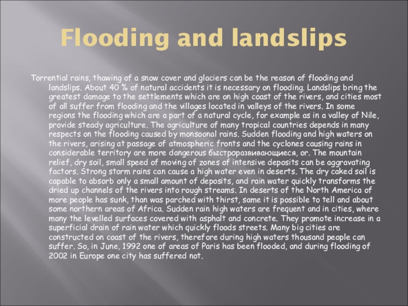 can be the reason of flooding and landslips. About 40 % of natural accidents it is necessary on flooding. Landslips bring the greatest damage to the settlements which are on high coast of the rivers, and cities most of all suffer from flooding and the villages located in valleys of the rivers. In some regions the flooding which are a part of a natural cycle, for example as in a valley of Nile, provide steady agriculture. The agriculture of many tropical countries depends in many respects on the flooding caused by monsoonal rains. Sudden flooding and high waters on the rivers, arising at passage of atmospheric fronts and the cyclones causing rains in considerable territory are more dangerous быстроразвивающиеся, or. The mountain relief, dry soil, small speed of moving of zones of intensive deposits can be aggravating factors. Strong storm rains can cause a high water even in deserts. The dry caked soil is capable to absorb only a small amount of deposits, and rain water quickly transforms the dried up channels of the rivers into rough streams. In deserts of the North America of more people has sunk, than was parched with thirst, same it is possible to tell and about some northern areas of Africa. Sudden rain high waters are frequent and in cities, where many the levelled surfaces covered with asphalt and concrete. They promote increase in a superficial drain of rain water which quickly floods streets. Many big cities are constructed on coast of the rivers, therefore during high waters thousand people can suffer. So, in June, 1992 one of areas of Paris has been flooded, and during flooding of 2002 in Europe one city has suffered not.