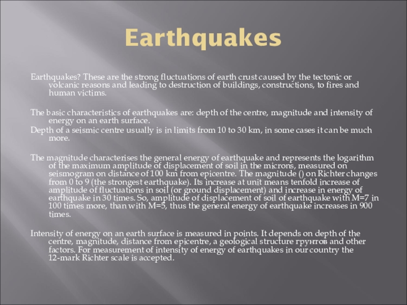Intensity of energy on an earth surface is measured in points. It depends on depth of the centre, magnitude, distance from epicentre, a geological structure грунтов and other factors. For measurement of intensity of energy of earthquakes in our country the 12-mark Richter scale is accepted.