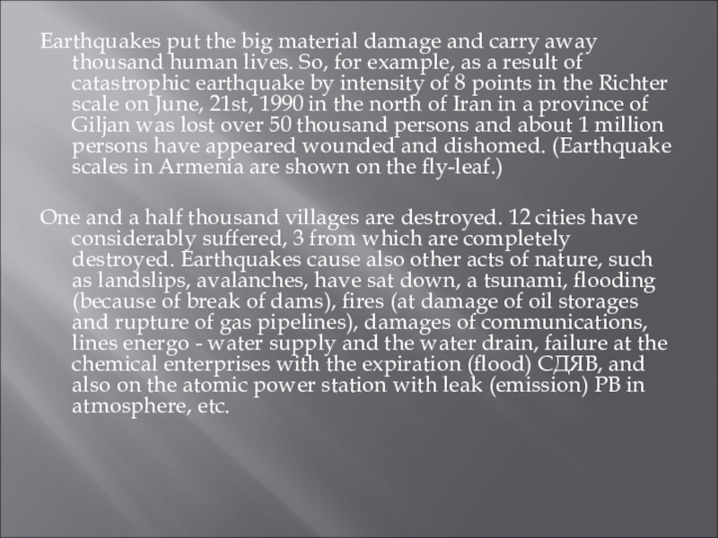 lives. So, for example, as a result of catastrophic earthquake by intensity of 8 points in the Richter scale on June, 21st, 1990 in the north of Iran in a province of Giljan was lost over 50 thousand persons and about 1 million persons have appeared wounded and dishomed. (Earthquake scales in Armenia are shown on the fly-leaf.)