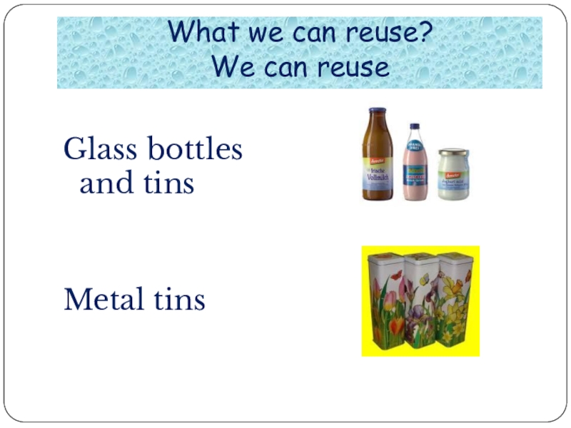 What we can reuse? We can reuseGlass bottles and tinsMetal tins